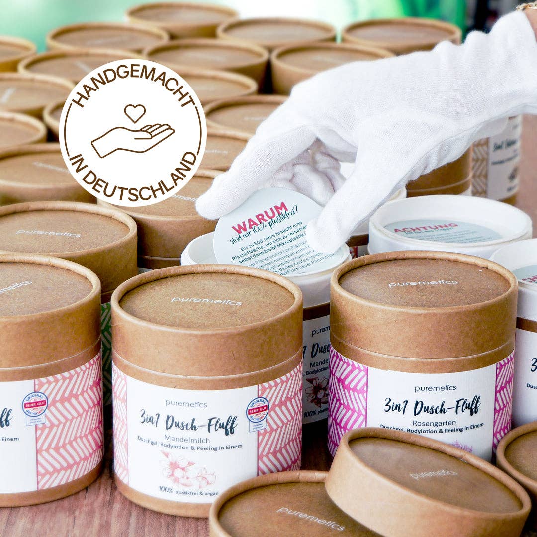 Super-Fluffig und Nachhaltig KUSCHELWEICHE HAUT OHNE EINCREMEN NACH DEM DUSCHEN! Dieses einzigartige Pflegeprodukt wurde geschaffen, um Ihrer Haut ein umfassendes Verwöhnprogramm zu bieten, und vereint die besten Eigenschaften von Duschgel, Peeling und Lotion in einem einzigen Produkt. Die seidige Textur schmilzt und schäumt auf der Haut und hinterlässt ein sauberes, erfrischendes Gefühl. Schmutz und Unreinheiten werden mühelos entfernt, während Sie die Wohltat eines sanften, natürlichen Peelings genießen, dass Ihre Haut glättet, ohne sie zu reizen. Noch während der Reinigung und dem Peeling wird Ihre Haut mit intensiver Pflege verwöhnt. Der Effekt? Eine seidig weiche Haut, die vor Feuchtigkeit besprüht wird und den ganzen Tag lang strahlt. HERGESTELLT IN DEUTSCHLAND *